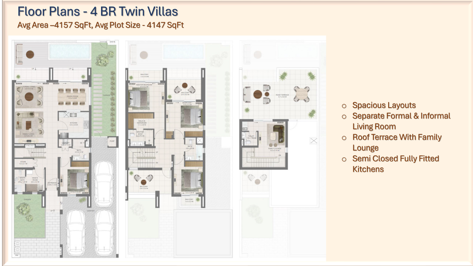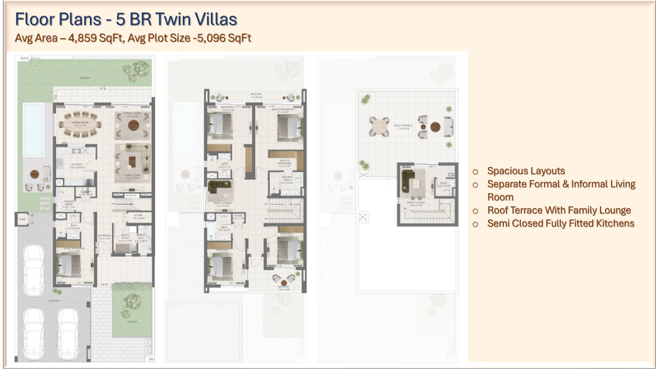 Интерьеры оформлены в спокойной цветовой палитре с использованием светлых и натуральных оттенков. Планировки включают полуоткрытую оборудованную кухню, комнату для персонала, основную гостиную и отдельную семейную зону отдыха. В спальнях предусмотрен выход на балкон. На верхнем уровне расположена просторная терраса. На участке — сад, парковка на 2–3 автомобиля и частный бассейн с зоной отдыха.