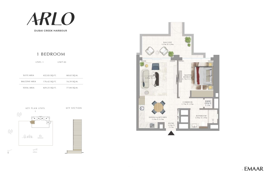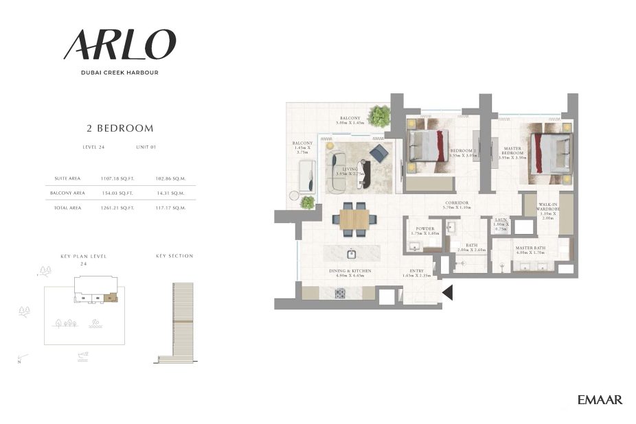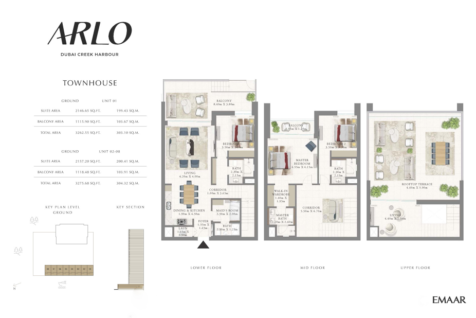 Arlo от Emaar Properties — премиальный жилой комплекс, расположенный в районе Dubai Creek Harbour, у живописного водного канала. В комплексе представлены апартаменты с 1, 2 и 3 спальнями, а также таунхаусы с тремя спальнями. Площадь резиденций варьируется от 65 до 304 м². Планировки продуманы до мелочей и включают один или несколько балконов, прачечные, гардеробные и дополнительные помещения, включая комнаты для персонала. В таунхаусах предусмотрены просторные террасы на крыше. Из окон открываются впечатляющие виды на канал, залив и городской горизонт.
