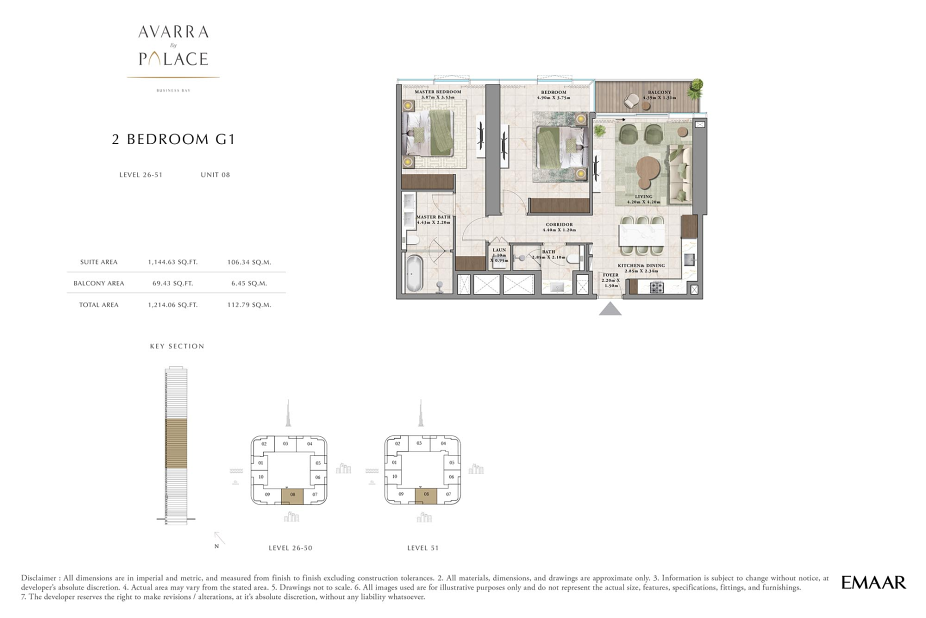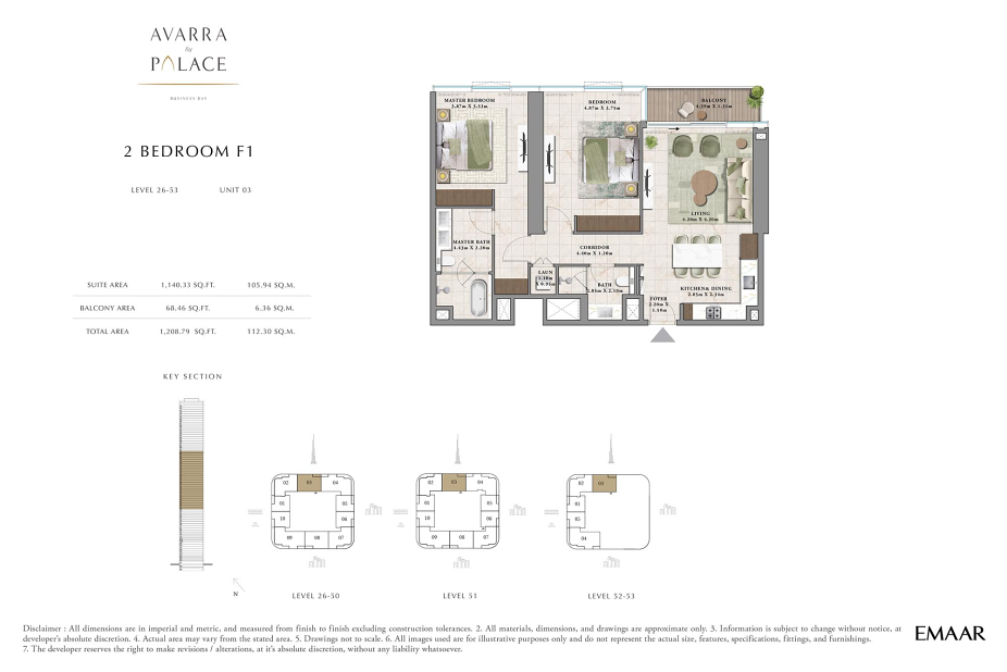 В комплексе представлено 687 эксклюзивных резиденций, включая 314 апартаментов с 1 спальней, 234 — с 2 спальнями, 118 — с 3 спальнями и 21 просторную резиденцию с 4 спальнями. Каждая квартира выполнена в концепции Palace Branded Living, где высококлассная отделка, премиальная меблировка и продуманные детали подчёркивают статус и утончённую элегантность пространства.