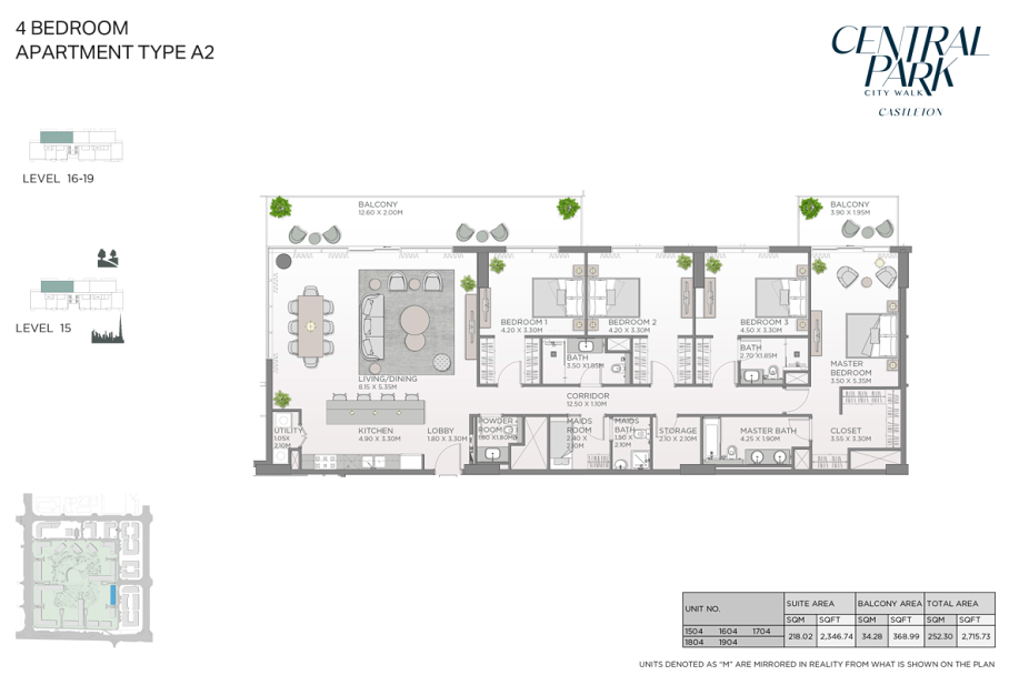Будущие резиденты могут выбрать апартаменты с 1, 2, 3 и 4 спальнями, площадью от 72 м² до 286 м². Во всех спальнях предусмотрены встроенные гардеробы, а в главных спальнях — просторные гардеробные. Каждая резиденция дополнена одним или несколькими балконами.