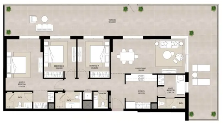 В комплексе представлены апартаменты с 1, 2 и 3 спальнями, а также просторные трёхспальные двухуровневые квартиры (duplex). Площади резиденций варьируются примерно от 55 до 131 м², а дуплексы достигают около 207 м². Все квартиры передаются с качественной отделкой «под ключ», оснащены немецкой кухонной техникой, а также включают парковочное место.