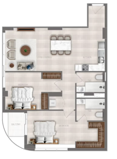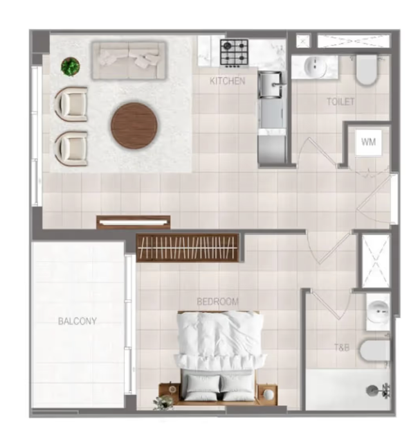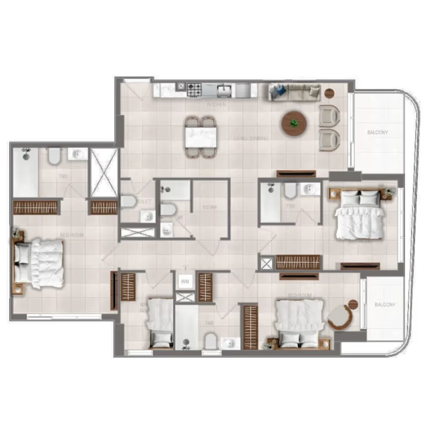 В комплексе представлены апартаменты с 1, 2 и 3 спальнями, разработанные с акцентом на функциональность, комфорт и современный стиль. Планировки продуманы таким образом, чтобы наполнить интерьеры естественным светом и создать ощущение свободы пространства.
