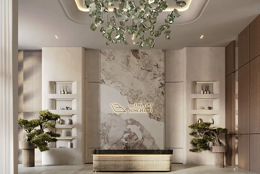Внешний облик здания выполнен в фирменном стиле Binghatti благодаря скульптурному фасаду из GRC-панелей. Интерьеры дополняют атмосферу уюта тёплыми древесными оттенками, латунными акцентами и мраморными вставками. На территории предусмотрены раздельные тренажёрные залы для мужчин и женщин с хорошей звукоизоляцией, а на первом этаже разместятся 9 тщательно подобранных торговых точек.