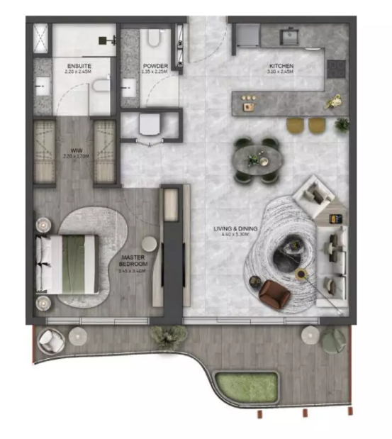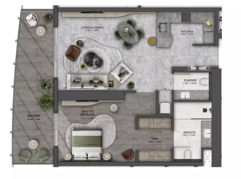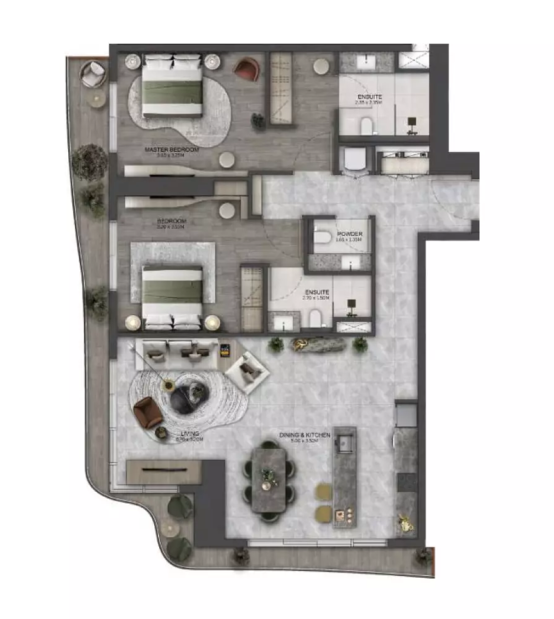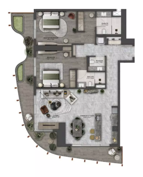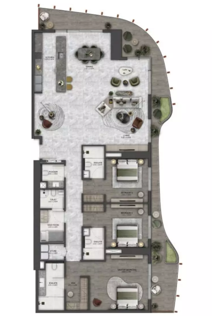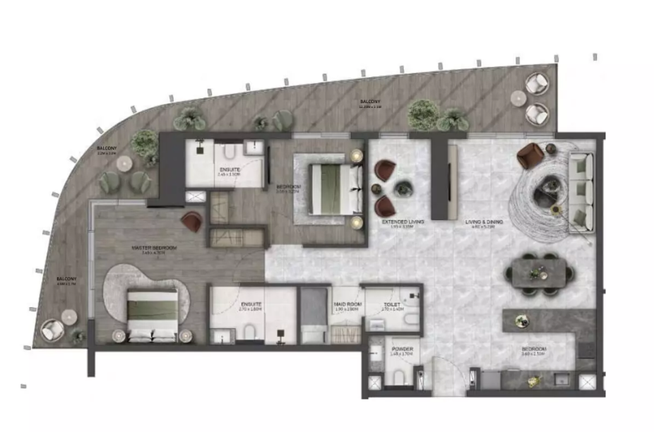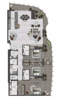 В комплексе предусмотрено 412 резиденций, среди которых представлены апартаменты с 1, 2 и 3 спальнями. Планировки разработаны с акцентом на комфорт, приватность и функциональность, создавая гармоничное пространство для современной городской жизни.