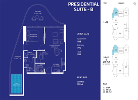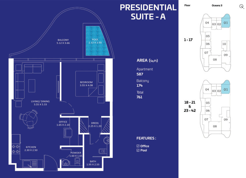 Архитектура здания сочетает изящные линии и выразительный современный дизайн, формируя эффектный силуэт на фоне городской панорамы. Проект предлагает коллекцию резиденций различного формата: студии, апартаменты с 1, 2 и 3 спальнями, а также просторные виллы с четырьмя спальнями и собственным бассейном. Многие резиденции дополнены приватными бассейнами и просторными балконами, откуда открываются панорамные виды на море и городскую линию горизонта.