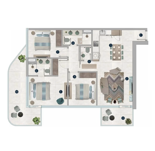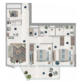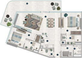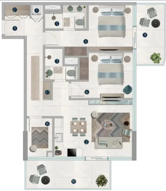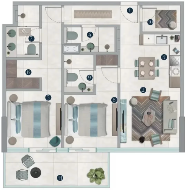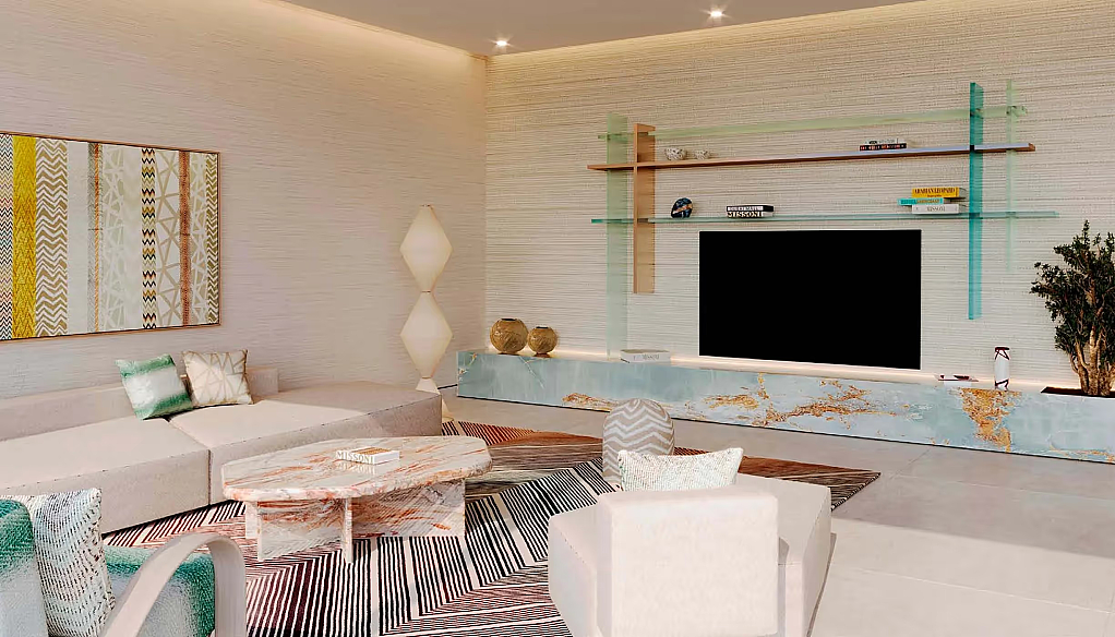 Каждая резиденция продумана до деталей: функциональные планировки сочетаются с выразительной отделкой и фирменными дизайнерскими акцентами Missoni. Панорамное остекление наполняет пространства естественным светом и открывает виды на водную гладь и ландшафты острова, создавая атмосферу уединённости и курортного комфорта.