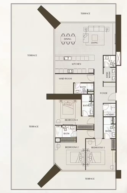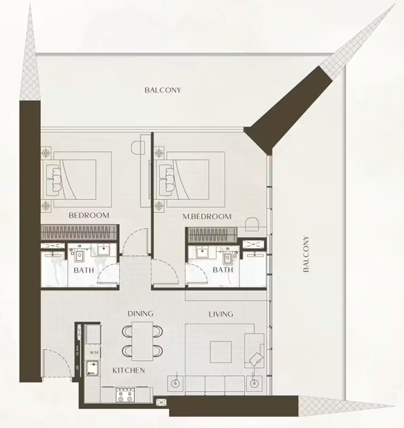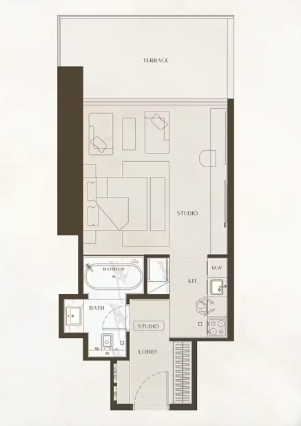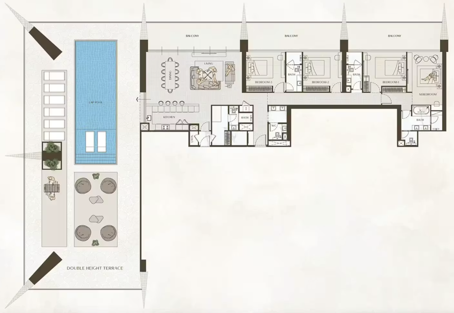 В комплексе представлены разнообразные форматы недвижимости: стильные студии, просторные апартаменты с 1, 2, 3 спальнями, эксклюзивные виллы с тремя спальнями и частными бассейнами, а также роскошные королевские пентхаусы с четырьмя спальнями. Из резиденций открываются захватывающие панорамные виды на Burj Khalifa, Dubai Water Canal и динамичный городской пейзаж Дубая.
