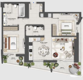 Планировочные решения разработаны с акцентом на комфорт и функциональность: большинство резиденций дополнены просторными террасами или балконами, а также дамскими комнатами. Высота потолков 3,3 метра создаёт ощущение простора, а система «умный дом» обеспечивает удобное управление основными функциями жилья. Интерьеры выполнены в светлой нейтральной палитре, формируя атмосферу уюта, лёгкости и современного стиля.