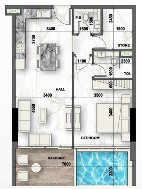 В продаже представлены студии, апартаменты с 1 и 2 спальнями. Уникальная особенность проекта — наличие приватного бассейна в каждой резиденции вне зависимости от планировки, что выводит формат комфортного жилья на совершенно новый уровень.