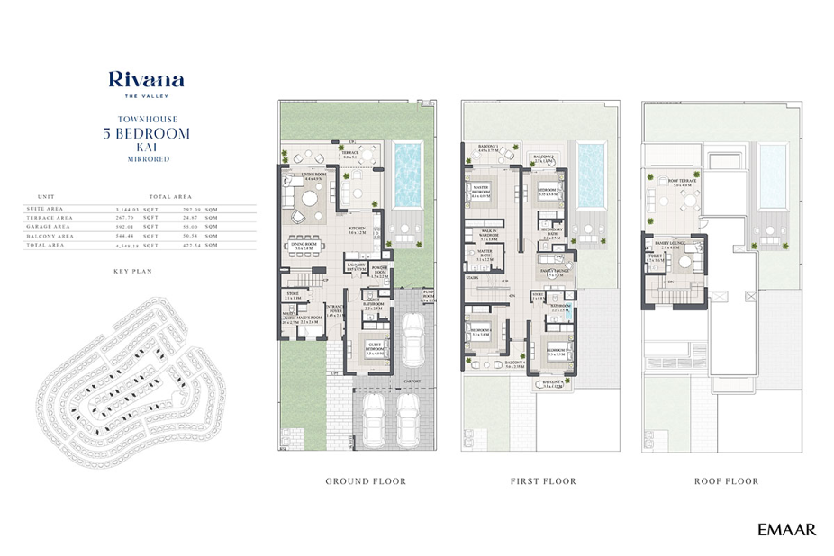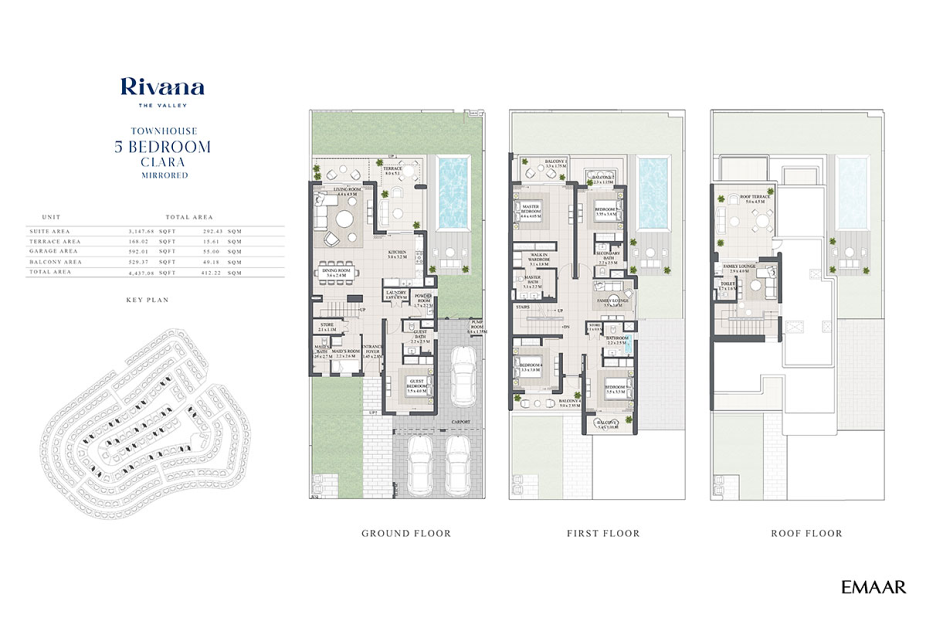 В Rivana представлены просторные twin-виллы с 3–5 спальнями. Площадь застройки резиденций составляет примерно от 288 до 409 м², а площадь участков — от 316 м² до 483 м². Все дома ориентированы на зелёные пространства и лагуны, что создаёт комфортную и спокойную жилую среду. Покупателям доступны два архитектурных стиля на выбор — Kai и Clara.