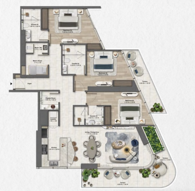 - роскошные пентхаусы с 5 спальнями, собственными садами на крыше и летними кухнями.