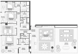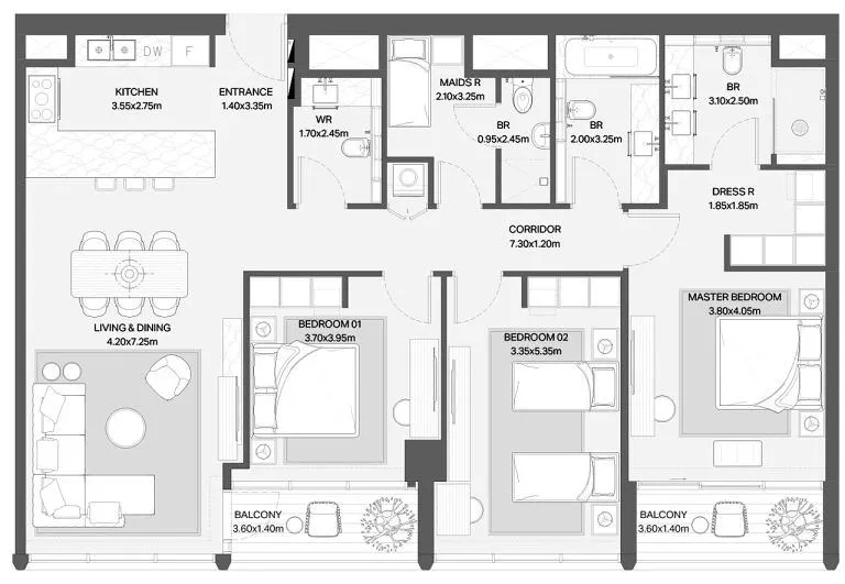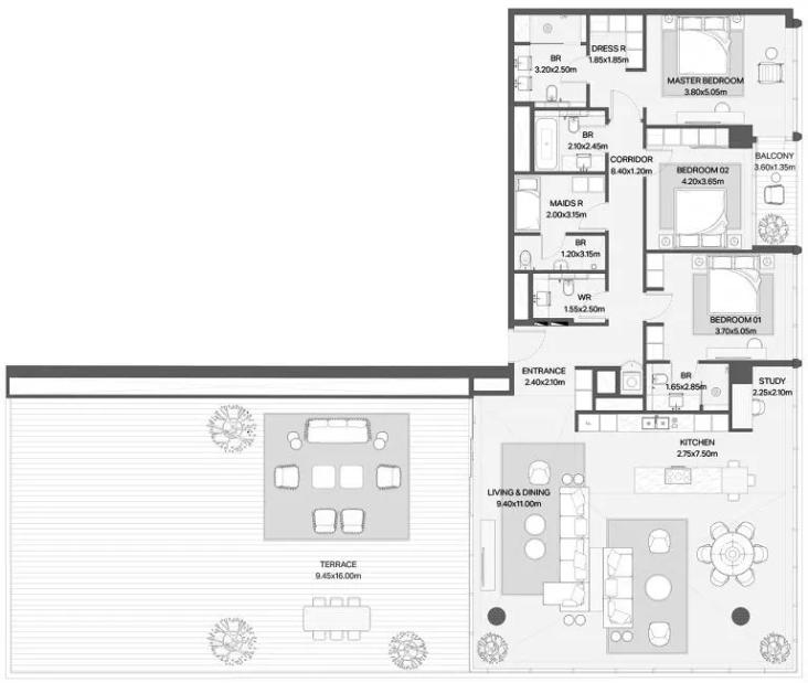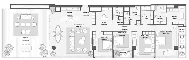 Площади резиденций варьируются от 73 до 857 м², создавая разнообразие планировок — от стильных компактных апартаментов до просторных представительских резиденций с панорамным остеклением и террасами. Каждый элемент архитектуры и дизайна подчеркивает премиальность пространства и внимание к деталям.