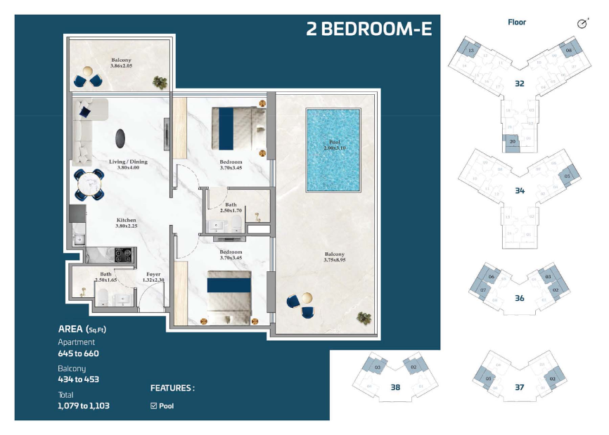 The high-rise features 44 levels, including basement and podium floors, and offers more than 40 luxury amenities. These include private pools in select residences, an infinity anticurrent pool, aquatic gym, outdoor cinema, spa, cricket and basketball courts, daycare center, jogging tracks, yoga deck, mini golf, and libraries.