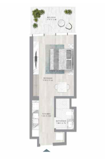 The complex features 376 residences, with 14 apartments on each floor. Future owners can choose from studios and 1–2-bedroom apartments, with the option to purchase an entire floor, making the project particularly attractive to investors seeking a stable rental income.