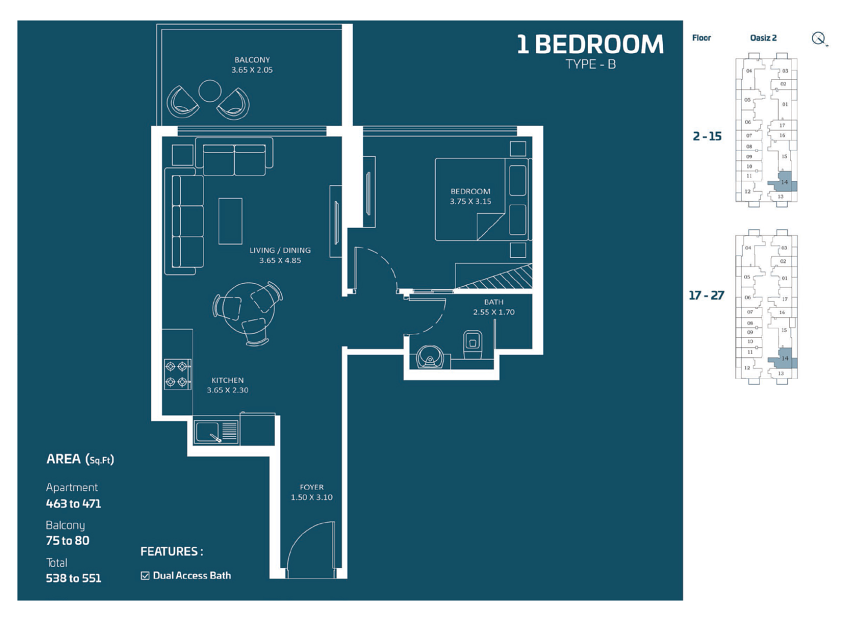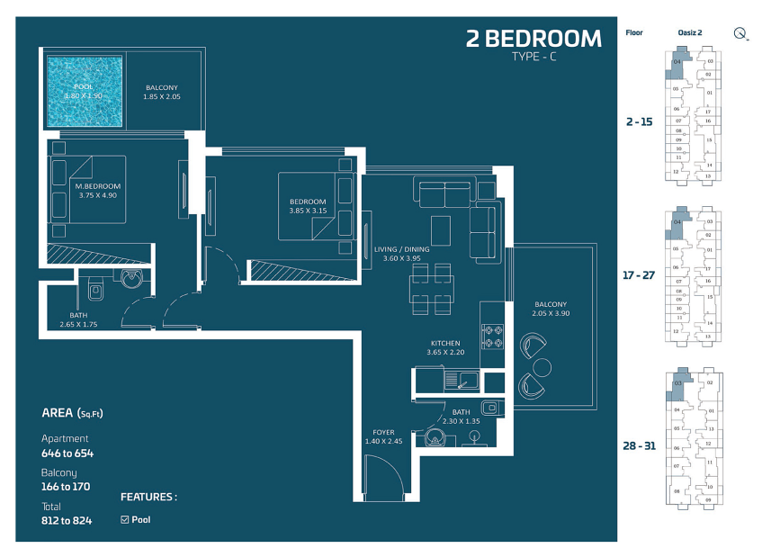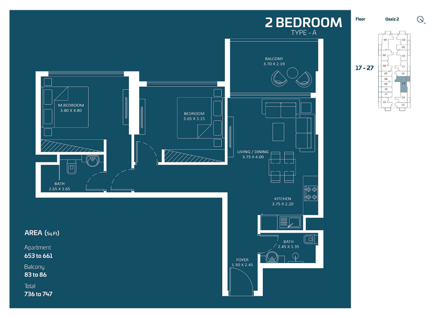 Oasiz 2 is the second phase of the popular Oasiz development in Dubai Silicon Oasis. This 31-storey residential tower offers units ranging from studios to 3-bedroom apartments, with the option for private pools. The design is contemporary, featuring panoramic windows and premium built-in kitchens.
