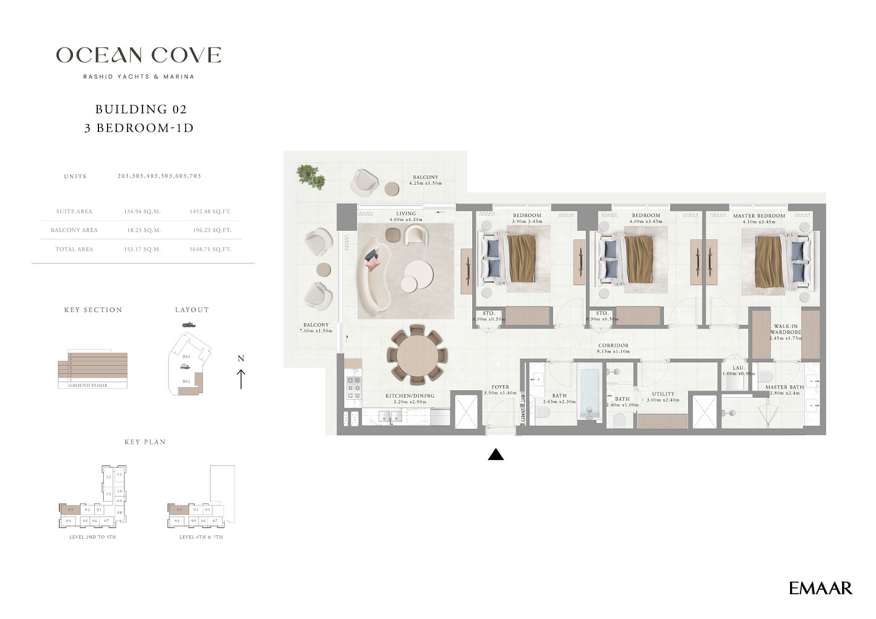 The development consists of two elegant towers offering 1, 2, and 3-bedroom apartments ranging from 73 to 172 sq.m. All residences feature functional layouts with spacious living areas, laundry rooms, and one or more balconies, while three-bedroom units also include additional storage rooms. Large windows and extended balconies provide stunning views of the marina and city skyline, filling the interiors with natural light.