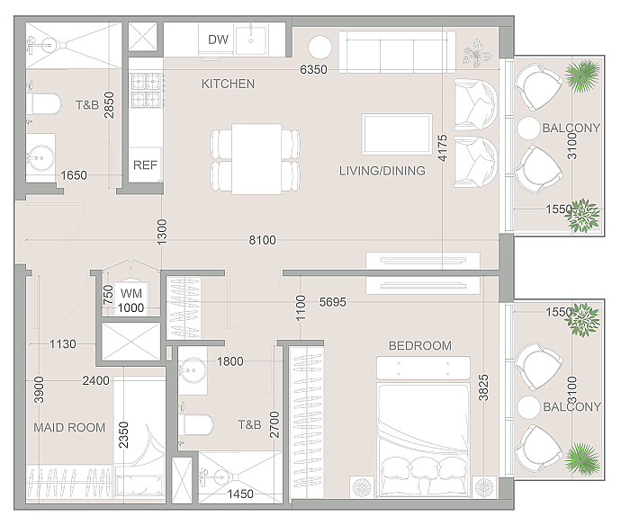 - Формат 1.5 BR: Продуманная планировка площадью 79 м² включает в себя не только просторную спальню, но и дополнительную комнату для персонала. Это решение делает апартаменты максимально функциональными — комнату также можно использовать как кабинет или удобную гардеробную.