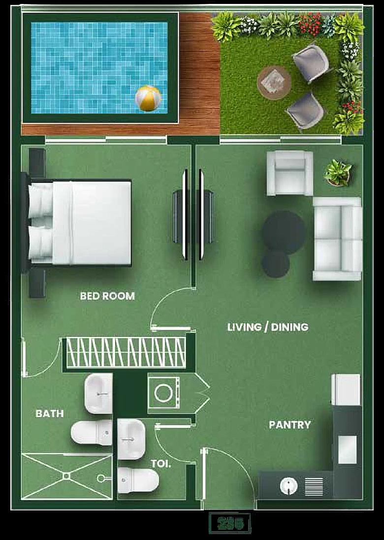 Главная особенность объекта — собственный бассейн, который превращает повседневную жизнь в формат курортного отдыха. Это редкое и престижное решение, подчеркивающее статус недвижимости и повышающее её инвестиционную привлекательность.