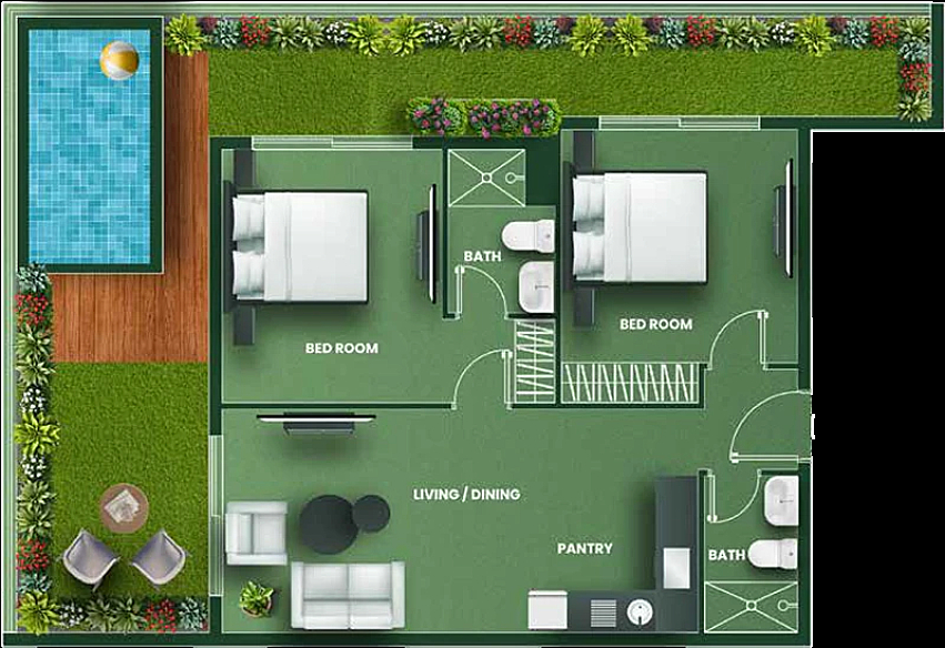 Квартира находится на 5 этаже 15-этажного дома и предлагается без мебели — вы сможете оформить интерьер по своему вкусу и создать пространство, полностью отражающее ваш стиль жизни. Продуманная планировка включает светлую гостиную, две спальни, функциональную кухню, современные санузлы и собственный бассейн на террасе.