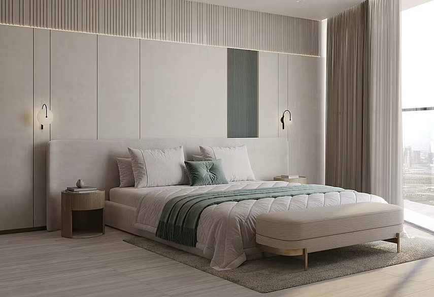 - Панорамные окна от пола до потолка обеспечивают естественное освещение и возможность наслаждаться городскими пейзажами Дубая.