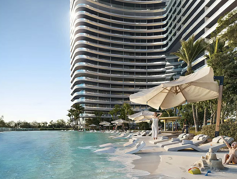 - Вид: Угловой обзор — на дорогу Umm Suqeim Road, внутреннюю инфраструктуру комплекса (бассейны/сады) и панораму района Arjan.