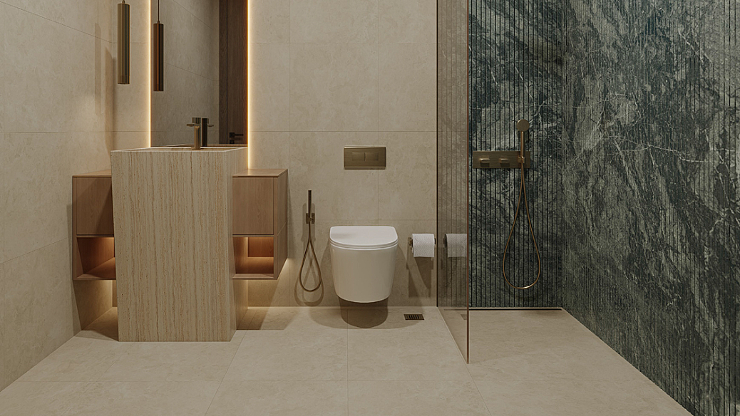 Внутри апартаментов применяются качественные современные материалы, включая керамогранит с текстурой дерева, тонированное стекло, металлические акценты и отделку в натуральных оттенках. Ванные комнаты оформлены с использованием износостойких и эстетичных материалов, сочетающих функциональность и современный стиль.