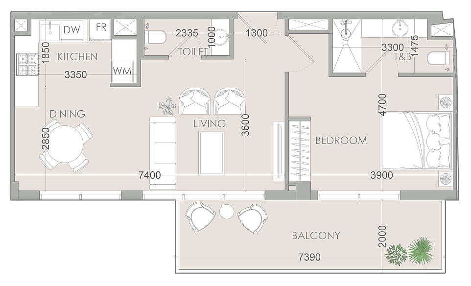 Апартаменты расположены на 5 этаже и имеют общую площадь 74 м². Продуманная планировка создаёт ощущение простора и уюта, а балкон площадью 15 м² становится полноценным продолжением жилого пространства — идеальным местом для отдыха, утреннего кофе или спокойных вечеров с видом на Dubai Sports City.