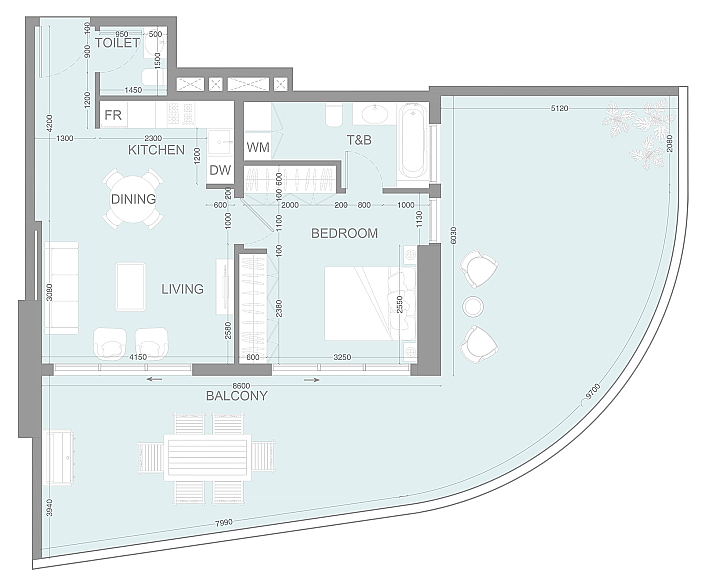 Площадь резиденции составляет 126 м², что позволяет создать гармоничное и функциональное жилое пространство, а большой балкон площадью 71 м² становится настоящим продолжением интерьера. Здесь можно обустроить зону отдыха, лаунж-площадку, зелёный уголок или пространство для уютных ужинов под открытым небом.