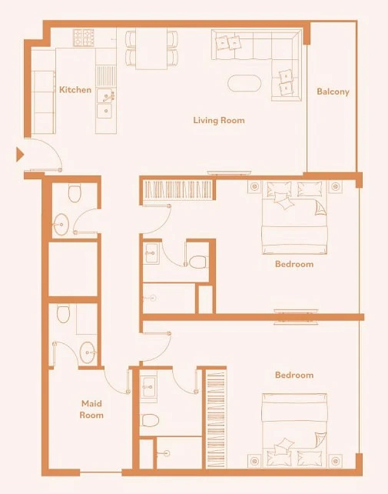 Квартира новая, общей площадью 115 м², расположена на 6 этаже 25-этажного здания. Апартаменты предлагаются без мебели, при этом кухня полностью укомплектована встроенной техникой. Планировка включает две спальни и просторную жилую зону, удобную для семейного проживания.