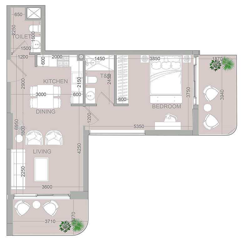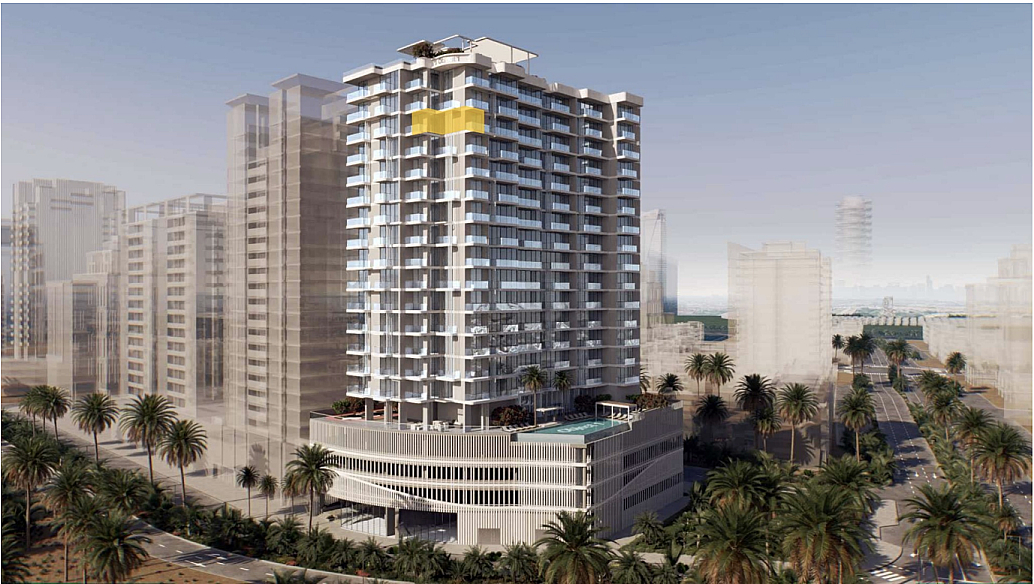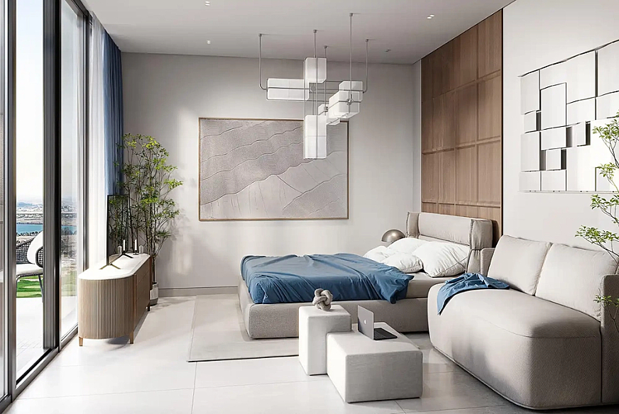 Апартаменты расположены на 14 этаже и имеют общую площадь 68 м². Просторный балкон площадью 15 м² открывает впечатляющие виды на JVC Community Park, бассейн и Dubai International Cricket Stadium, создавая атмосферу уюта и приватности. Открытая планировка с панорамными окнами во всю высоту стен наполняет пространство естественным светом и подчёркивает ощущение простора.