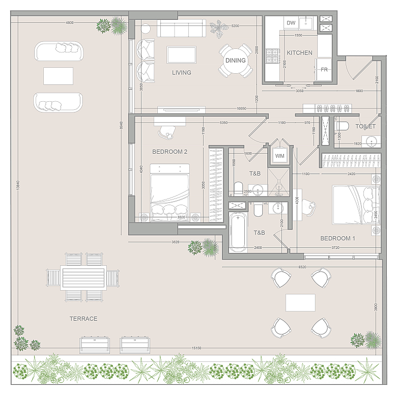 На первом этаже проекта V1stara House расположены просторные и эффектные апартаменты с двумя спальнями Type A — идеальное пространство для тех, кто ценит стиль, масштаб и атмосферу современного премиального жилья.