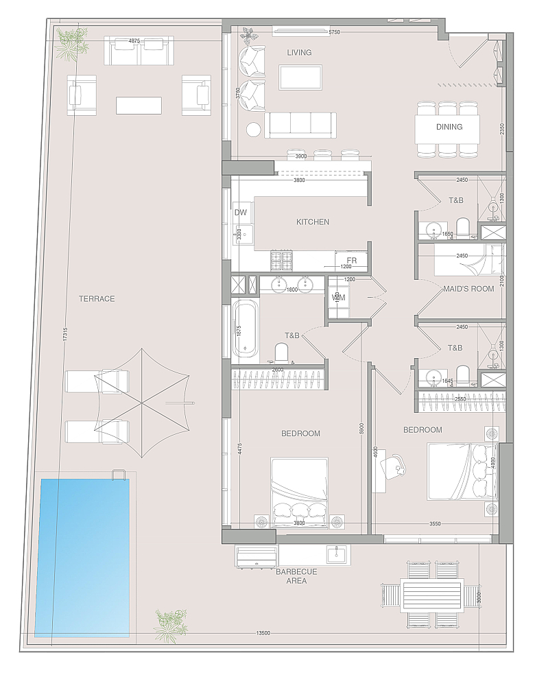 Площадь резиденции составляет 227 м², что позволяет создать продуманное зонирование для семьи и обеспечить максимум удобства в повседневной жизни. Дополняет планировку роскошный балкон площадью 114 м² — настоящая приватная терраса, где можно организовать лаунж-зону, открытую столовую, зелёный сад или место для отдыха с панорамным видом.