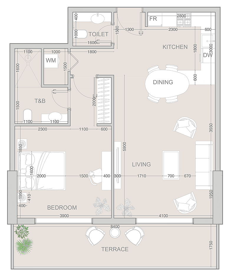 На 10 этаже современного комплекса V1VID Tower от Object1 расположена стильная и продуманная 1-спальная резиденция Type F (Unit 1008) — идеальный выбор для тех, кто ценит комфорт, функциональность и гармоничное пространство для жизни.