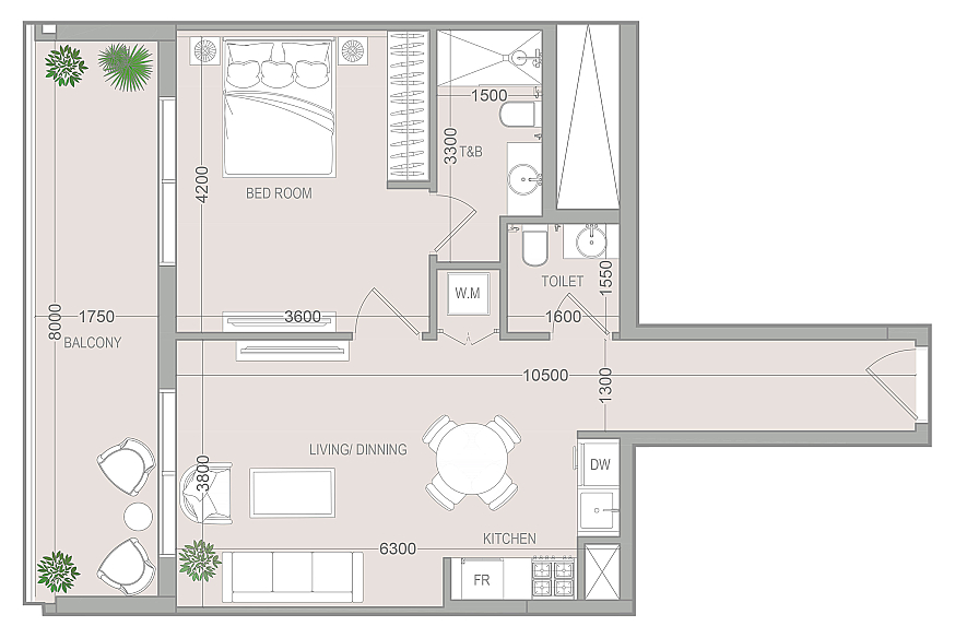 Предлагаемая квартира — апартаменты с одной спальней (Type H_1), расположенные на 4 этаже (№418). Общая площадь составляет около 74 м², из которых примерно 58 м² приходится на жилую зону, а балкон занимает около 16 м².