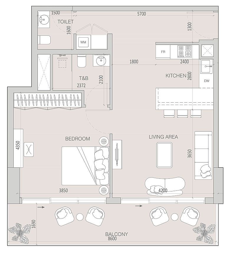 На 2 этаже стильного комплекса W1nner Tower от Object1 представлена элегантная 1-спальная резиденция Type E (Unit 204) — гармоничное сочетание продуманного дизайна, функциональности и атмосферных видов.