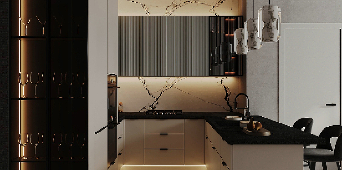 — современная кухня оснащена стильными шкафами и встроенной бытовой техникой;