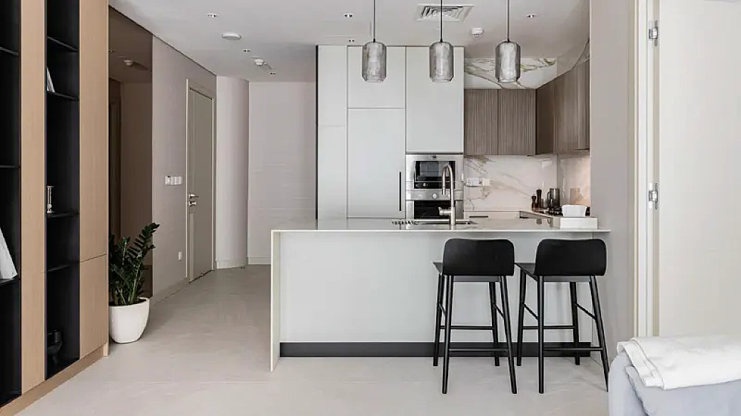 — современная кухня оборудована стильными шкафами и встроенной техникой;
