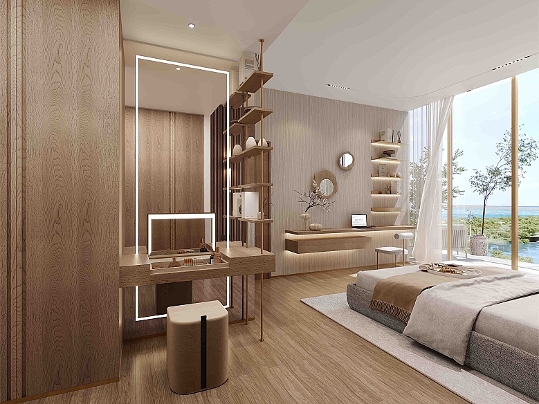 Резиденция выполнена в утончённом современном стиле с акцентом на комфорт и качество жизни. Каждое пространство продумано до мелочей и оформлено с использованием натуральных материалов, гармоничных форм и высококачественной отделки. Высокие потолки и панорамное остекление наполняют квартиру естественным светом, создавая атмосферу уюта, спокойствия и визуального простора. Балкон служит приятной зоной для отдыха и наслаждения видами на бассейн.
