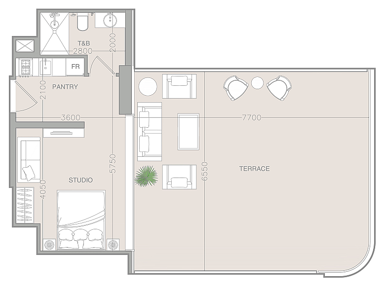 Квартира выделяется просторной планировкой и увеличенной террасой, которая значительно расширяет жилое пространство и может использоваться как зона отдыха или дополнительная функциональная площадь. Большие окна обеспечивают хорошее естественное освещение.