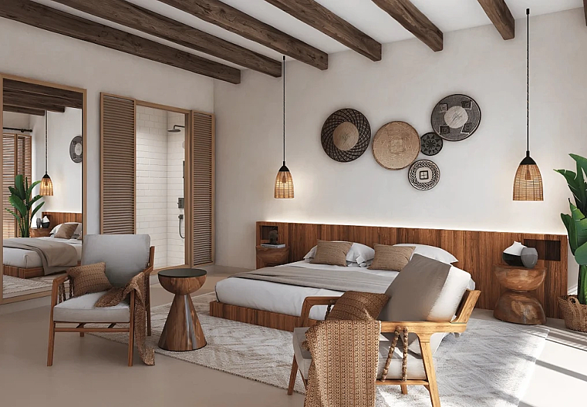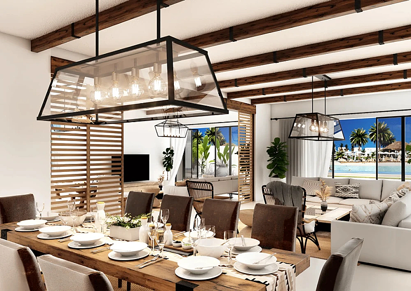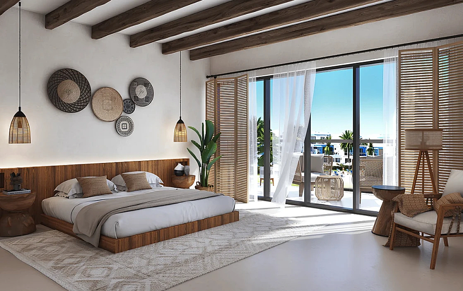Архитектура выполнена в средиземноморском стиле: белые фасады, терракотовые крыши и уютная атмосфера испанского прибрежного городка. Из окон открываются панорамные виды на зелёные зоны и лагуны комплекса.